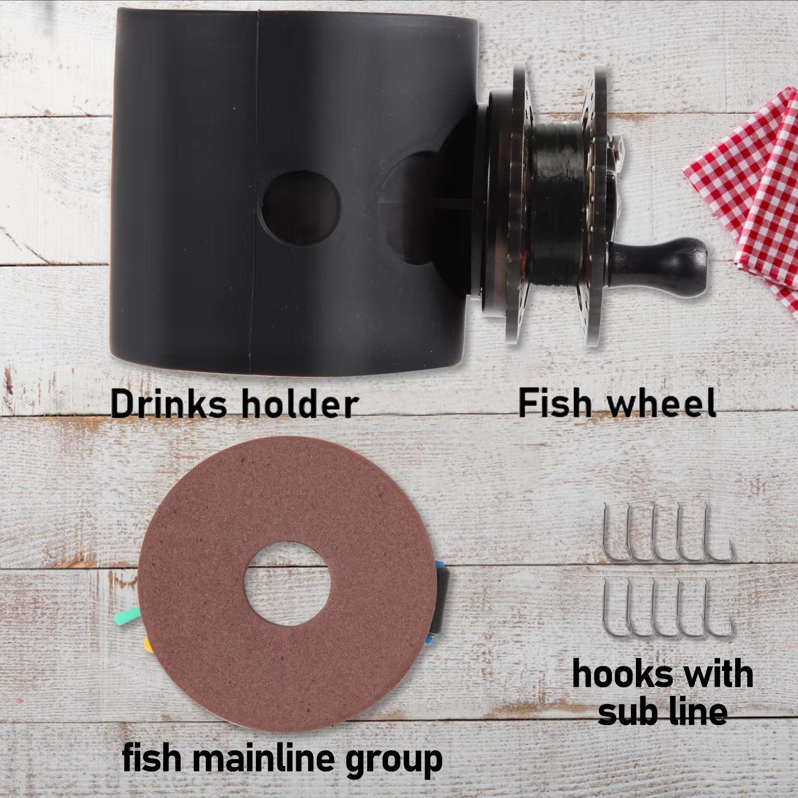 · 1 pack product including a fish wheel attached on drink holder, fishing line (unassembly) , 10pcs hooks and 1pcs instruction card.